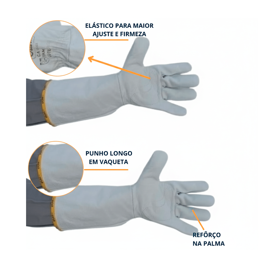 • Punho: Longo (20cm) totalmente em vaqueta